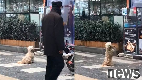In the video, a beige stray dog is sitting in front of a small vendor. His eyes cannot be separated from the food for a second. He suddenly straightens his body and puts his hands together, swings his little hands back and forth to beg for food, hoping that the proprietress will reward him with some scraps of food. His messy hair is all knotted, and he looks like a rag. The sight of him trying so hard to beg for food is quite sour.