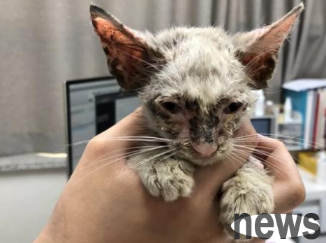This kitten is only two months old, but it is severely malnourished. It is also infected with skin diseases and the herpes virus, which has caused ulcerative conjunctivitis. Even doctors are not sure whether the cat can survive.