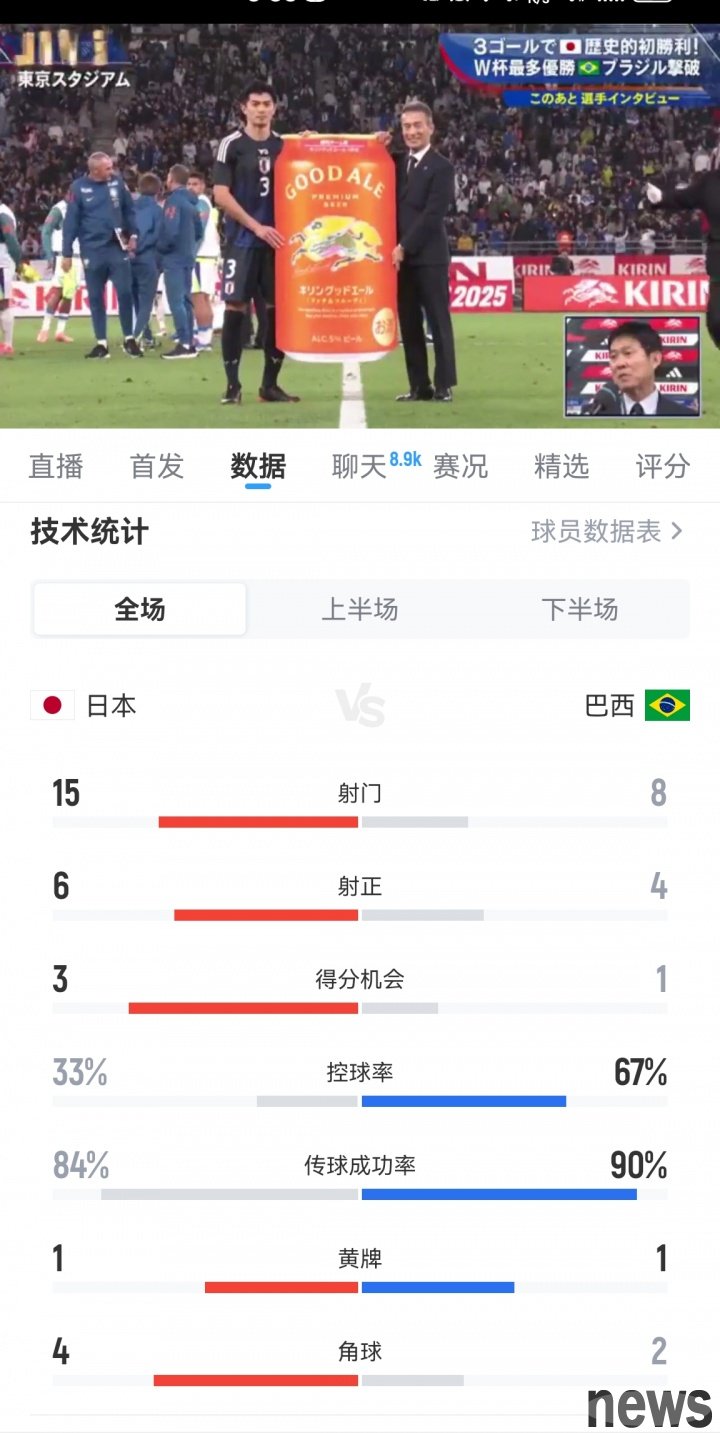 Japan scored three goals in a row to reverse the Brazilian team 3-2. The data of this game is as shown in the picture.