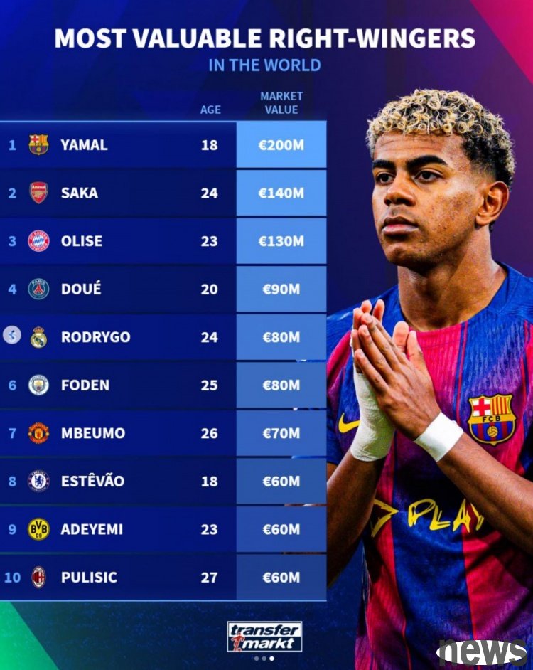 Germany ranks among the current world football right winger worth rankings, with Yamal ranking first with 200 million euros, Saka second with 140 million euros, and Olise third with 130 million euros.