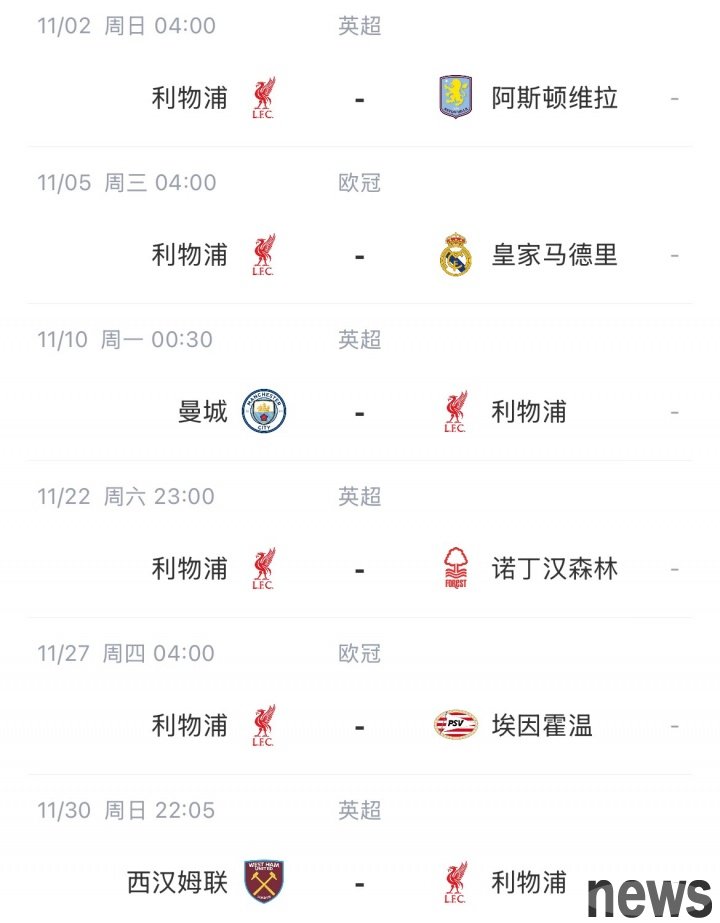 Liverpool has a tough schedule in November, facing Villa in the league on the 2nd, Real Madrid in the Champions League on the 5th, and then an away game against Manchester City.